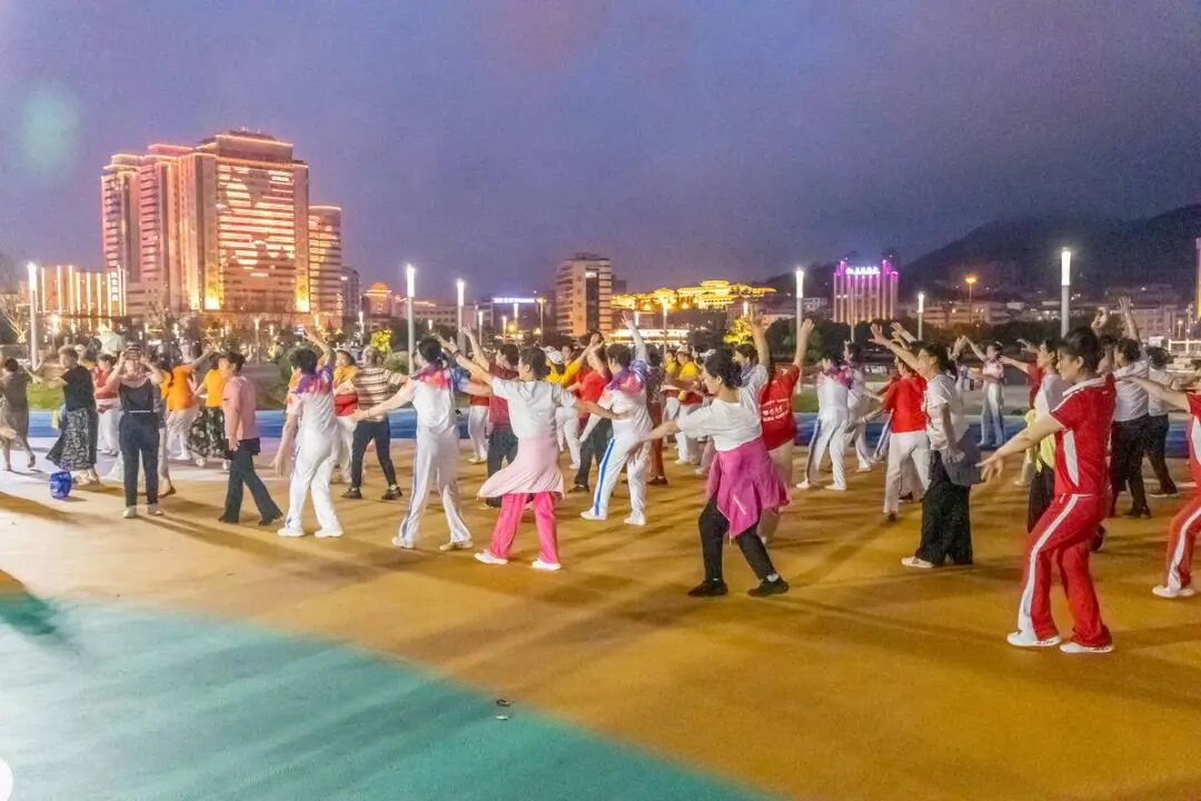 伴随着悠扬的旋律,学员们热情高涨,广场的群众也被深深吸引,纷纷驻足加入,有带娃玩耍的奶奶,有外地旅游的小情侣,有牵着小狗散步的姑娘,也有纳凉的老爷爷。她们认认真真地听着姚老师讲解,反复练习舞步。步伐逐渐整齐划一,动作协调一致。整个队伍洋溢着蓬勃的朝气与活力,充分展现了全民健身的魅力。一举一动都展现出了健康向上、积极进取的精神风貌。